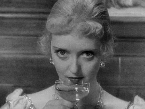 [Bette Davis, nella parte di Mildred Rogers nel film Schiavo d'amore (1934) sorseggia vino da un calice, lo sguardo fisso in camera. Fonte.]