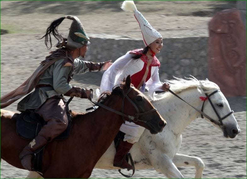 [Alt text: Una fotografia dello sport nazionale kirghiso “Kyz Kuu”. In foto si vede un giovane cavaliere vestito in abiti tradizionali cercare di prendere una donna sorridente che fugge a cavallo.]