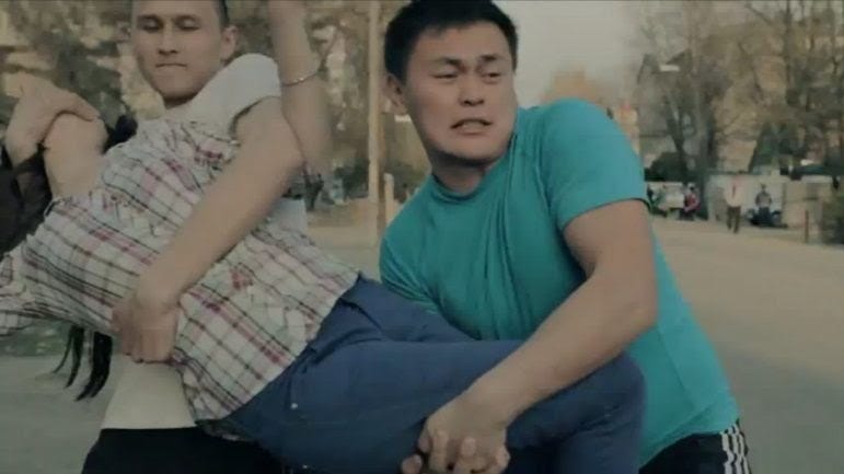[Alt text: un fotogramma dal film di Petr Lom, Bride Kidnapping in Khyrghizistan, nel quale due ragazzi sollevano con la forza una ragazza che, disperata, cerca di fuggire.]