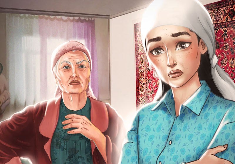 [Alt Text: un fotogramma dall’app di edutainment “Spring in Bishkek”. Nell’immagine sono rappresentate due donne. Una anziana e con atteggiamento minaccioso, l’altra giovane e terrorizzata mentre indossa la sciarpa matrimoniale, il jooluk.]