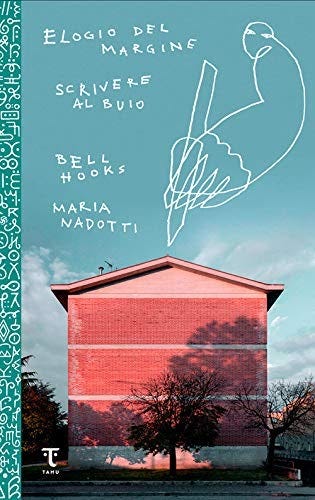 [Alt Text: la copertina di Elogio del margine/Scrivere al buio di bell hooks edito da Tamu. Lo schizzo di una figura che regge una matita è accostata alla fotografia di una casa, due alberi vicino al muro.]