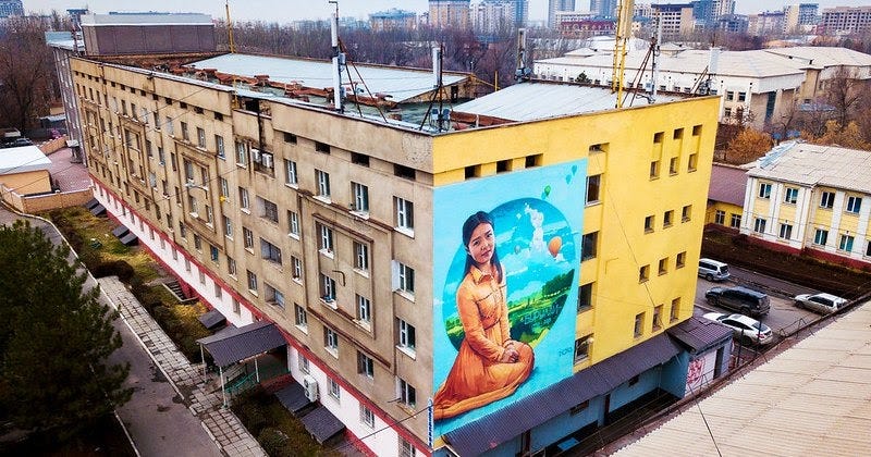 [Alt text: una ripresa dall’alto del murale dedicato a Burulai, diciannovenne uccisa dal proprio rapitore e ora simbolo della lotta contro l’Ala Kachuu. Il murale si trova nella città di Bishkek.]